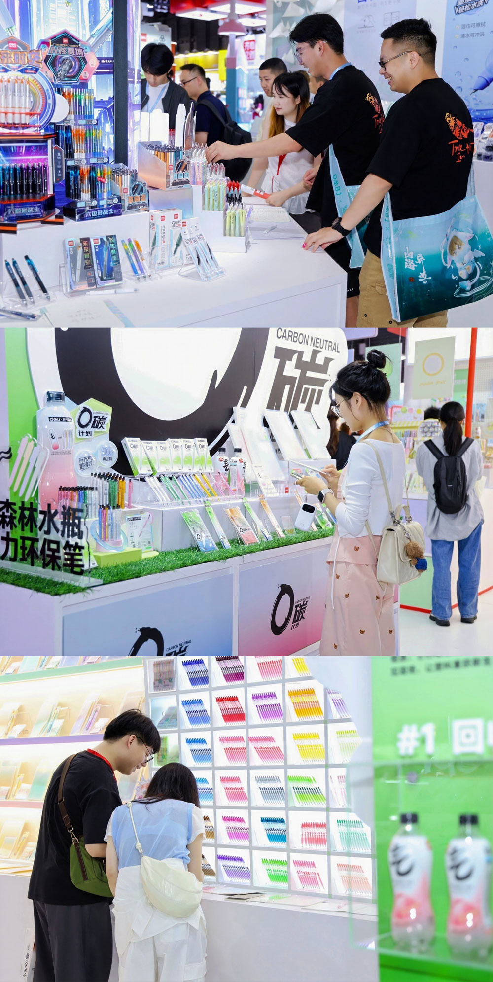 文具区里,黑科技、色彩大师、环保等专区的创新产品同样令人惊艳。六边形战士、液态硅胶、防断芯活动铅笔等是行业前沿的产品;色彩大师专区里展示了众多契合Z世代美学需求的高颜值产品;而得力与元气森林联名系列的环保碳中和系列文具,则展现了得力绿色、环保的理念。一位现场体验者感叹,“得力的变化太大了,没想到能看到这么多的文创IP产品,并且功能文具的创新设计让我感受到文具不仅实用,还有无限的可能性。”